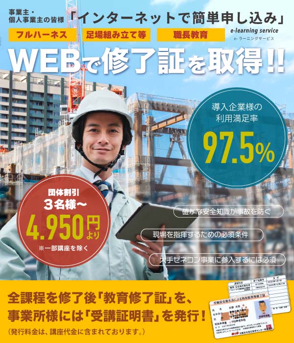 危険が伴う高所での作業を請け負う会社で現場作業員の一人一人の安全性を改めて学ぶことができました。オンラインなので日曜日でも講習が可能でしたので作業員全員の教育修了証を取得できました。